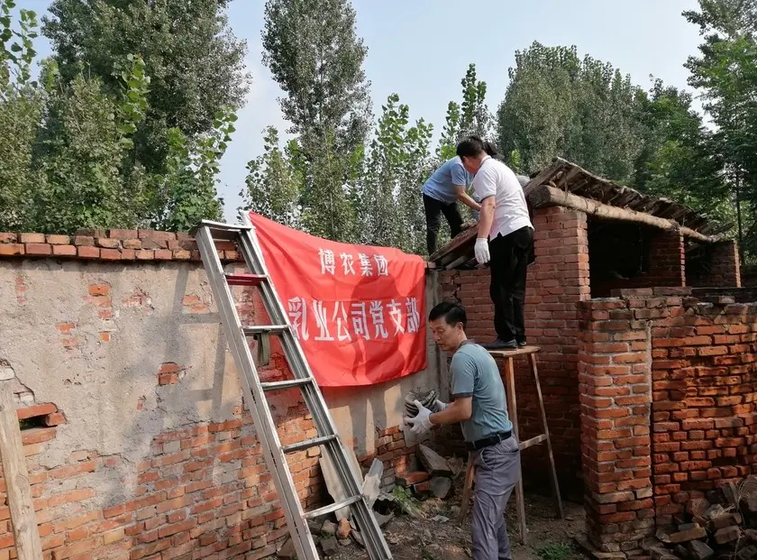 貧困戶魏澤美家是博農乳業(yè)公司對口扶貧幫扶戶,公司黨支部了解到魏澤美家中廁所年久失修,給其生活造成不便的實際情況,經(jīng)過研究,決定發(fā)揮公司支部黨員水電、建筑等人才優(yōu)勢,組織黨員直接參與其廁所整修工作。30日下午,乳業(yè)公司黨員12人克服天氣炎熱、工作環(huán)境條件復雜的多重困難,全身心投入到廁所整修工作中,有的撤除房頂,有的焊接梁架,有的開挖水溝,有的連接電路,用整整一下午時間,完成了房頂撤除更換、連通水電的任務,幫扶工作受到貧困戶魏澤美的交口稱贊。